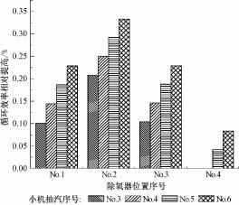 由图3、表4及表3可知:对于任意一组抽汽口,旋膜式除氧器和小机都有与之对应的佳位置;反之亦然。旋膜式除氧器和小机位置对佳抽汽口的确定具有重要影响,因此,对各加热器汽源优化时,有必要将旋膜式除氧器和小机位置的优化考虑在内。